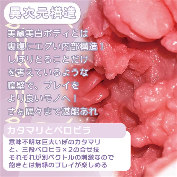 箱開けてプニプニの美白ボディ触った瞬間、もう興奮MAX。ローション塗って先端当てたら、入口の巨大イボがボコッと押し返しつつ3連ベロビラがペロペロ絡みついてきて、ヌルッと入った途端に舌がビヨンビヨン跳ね回るのエロすぎ! ゆっくり押し込むだけでベロが亀頭をぺろぺろ舐め上げて、カリを何枚もの舌で挟み込んでくる感覚…まるで本物のフェラチオみたいに温かくねっとり包まれて、腰が勝手にクネクネしちゃう。中間部の細か膣壁が優しく締め付けて、最奥ベロがカリ裏を集中攻撃したら、もう我慢汁ダラダラでヌチャヌチャ音が止まらない。高速ピストンしたらベロが跳ねまくって多角的にえぐってくるから、全身ビクビク痙攣しながら一気にドクドク大量射精! 抜いた後もベロの余韻で先端がジンジン疼いて、連続イキ余裕。ふわとろ外層のおかげで痛みゼロなのに、内側のコリコリベロがしっかり刺激してくれて、毎回新しい舐められパターンで飽きない中毒ホール。ベロビラの跳ね返りが生き物みたいで、フェラ妄想が爆発する神アイテムだわ!